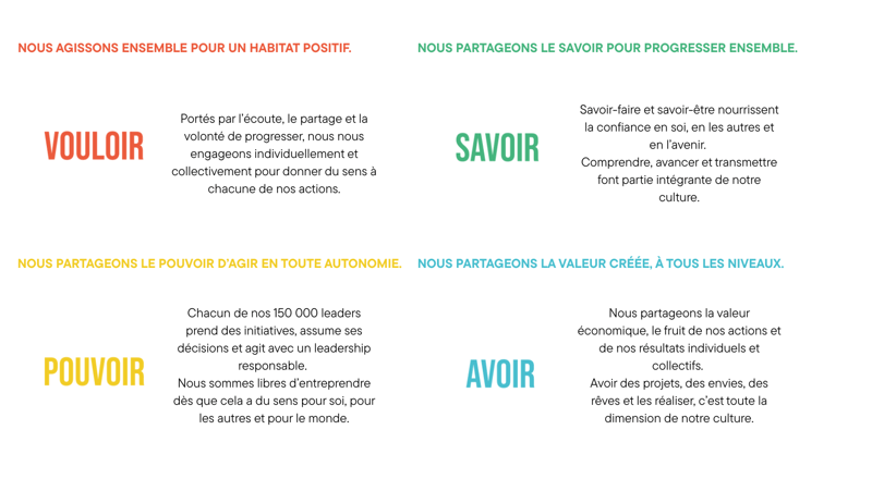Notre culture du partage que l'on tire de notre appartenance au groupe ADEO repose sur 4 piliers, le VOULOIR, le SAVOIR, le POUVOIR et l'AVOIR.